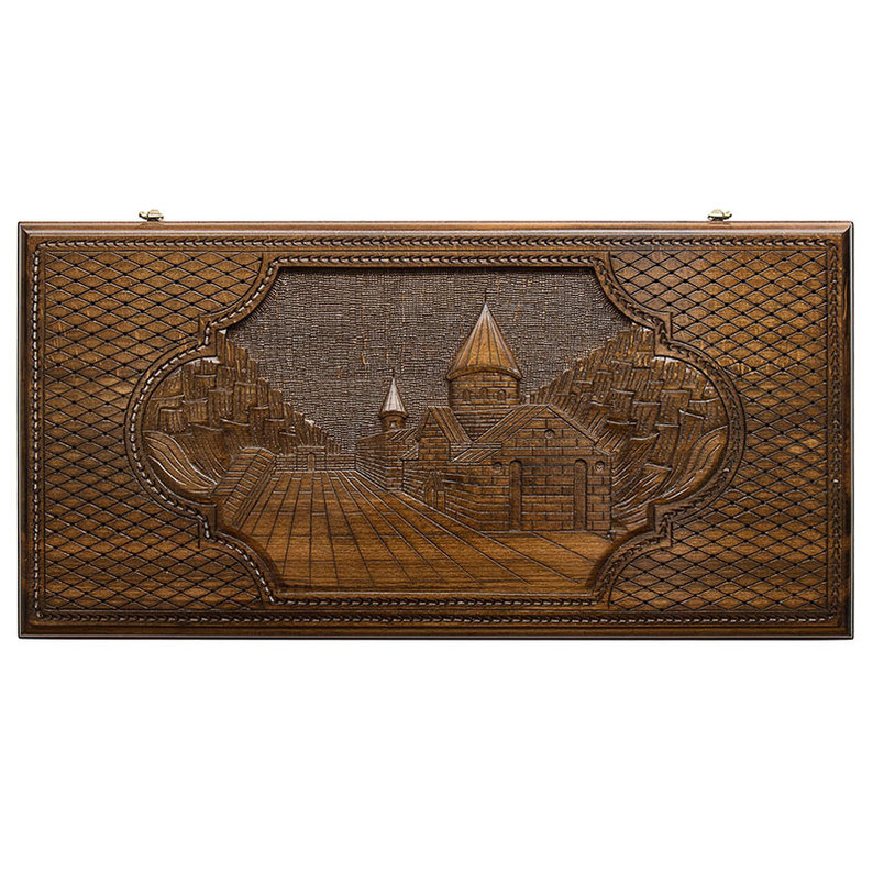 Доска прямоугольная, с ровными сторонами. Лицевая поверхность представляет собой вырезанное изображение монастыря Гегард, окруженного мелкой геометрической резьбой. Вторая половинка оборудована полем для игры в шашки, для чего можно будет использовать комплектные фишки. Вокруг него также имеется узорчатое украшение. Внутри сама игровая поверхность с ячейками, подчеркнутыми незамысловатым каплевидным узором, а в центральной части присутствует радиальный. По бокам имеются прорези, позволяющие удобно складывать фишки при необходимости. Примечательно, что все действия производились вручную, без использования современного оборудования, что придает еще большую ценность.