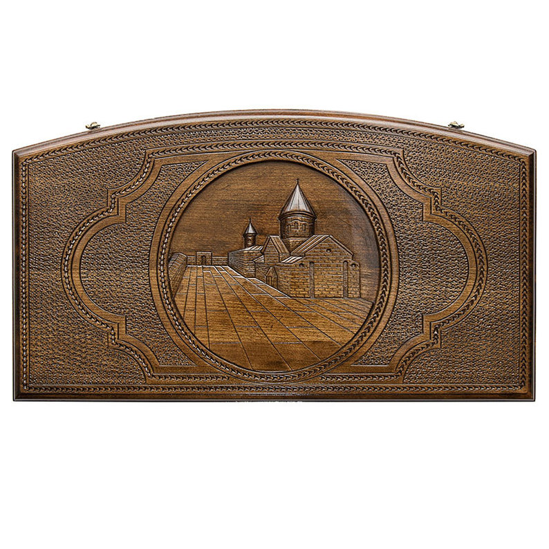 Доска выполнена в квадратном варианте, с закругленными противоположными сторонами. Лицевая поверхность украшается мелкой резьбой, выполненной ручным способом. В центре находится вырезанное изображение монастыря Гегард в Армении, причем с очень хорошей детализацией. На обратной половине находится языческий храм Гарни. Изнутри, по центру, расположились кисти винограда, а по бокам – ячейки, окаймленные светлым узором. На боковых гранях предусмотрена специальная ложбинка, куда можно складывать фишки. Петли и крючки выливаются из мягкой бронзы, в уникальной форме, с эмблемой производителя.