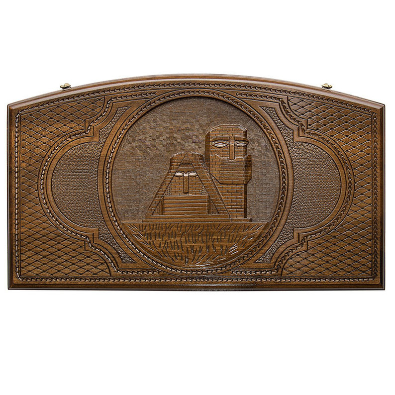 У доски 2 грани прямые, а 2 округлые, что в итоге придает ей интересный внешний вид. На внешних поверхностях выполнен мелкий геометрический узор. В середине лицевой стороны находится изображение древнего мемориала Арцах, окруженного круговой «строчкой». С обратной стороны имеется поле для шашек и шахмат, радиальные узоры. Изнутри все не менее красиво – по центру находится изображение раскрывшегося граната, ячейки подчеркиваются каплевидным узором. Для удобства предусмотрены углубления, идущие по бокам, куда помещаются фишки.