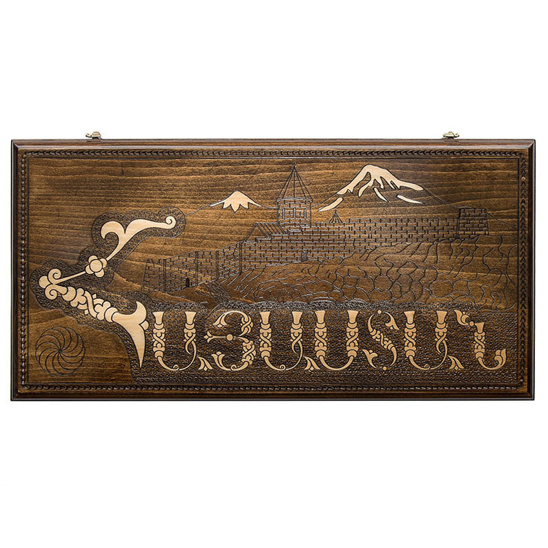 Доска выполнена в стандартном прямоугольном варианте, с четкими, ровными гранями. На лицевой поверхности выполнена целая картина, изображающая армянскую крепость на холме. Смотрится это максимально эффектно. На второй стороне имеется поле для игры в шашки, или шахматы, при наличии фигурок. Оно также окаймлено мелким узором. Внутренняя поверхность украшена узором в виде «солнца», а каждая отдельная ячейка отмечена светлым рисунком. По бокам имеются прорези, куда можно складывать комплектные фишки.