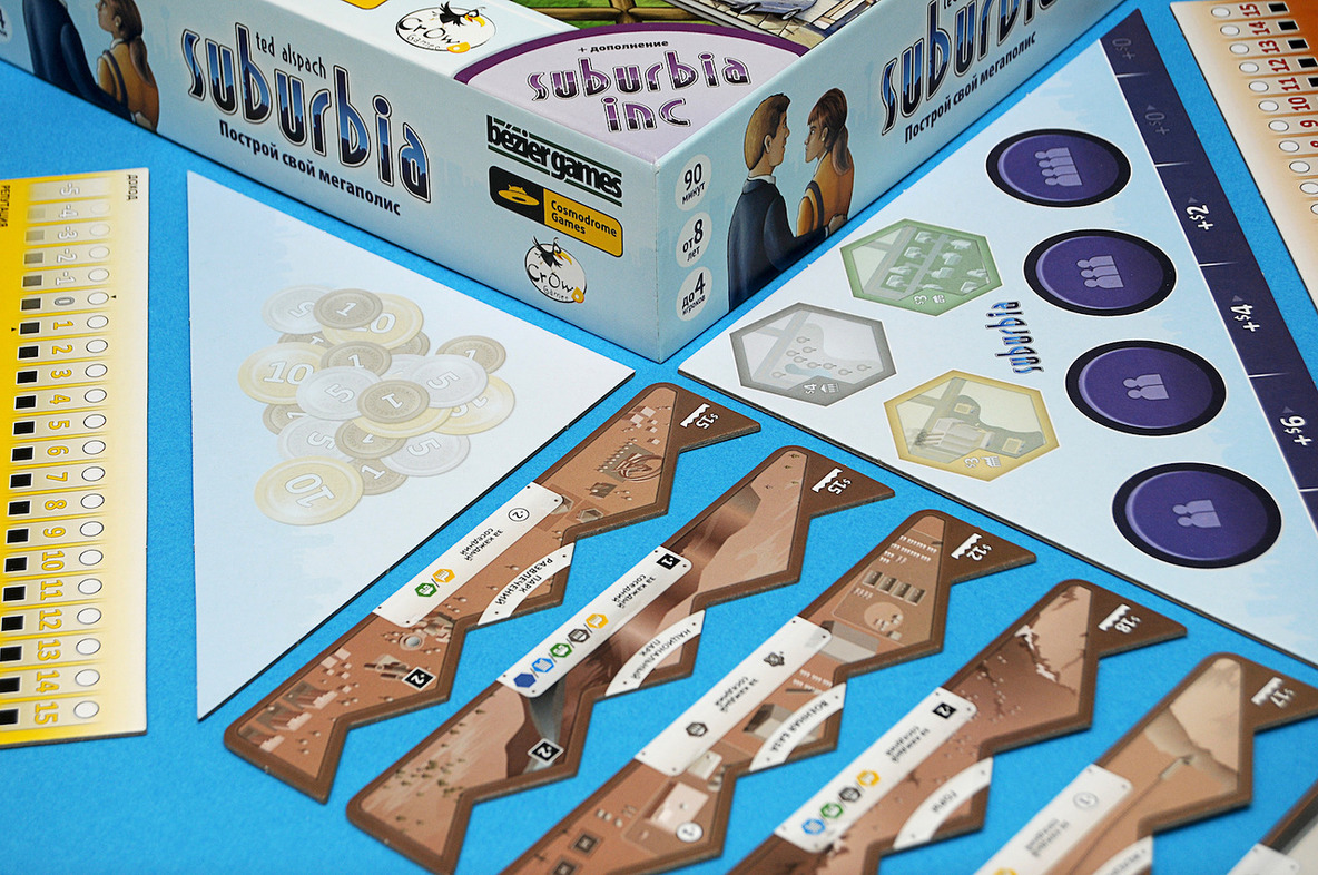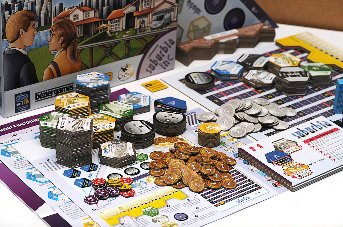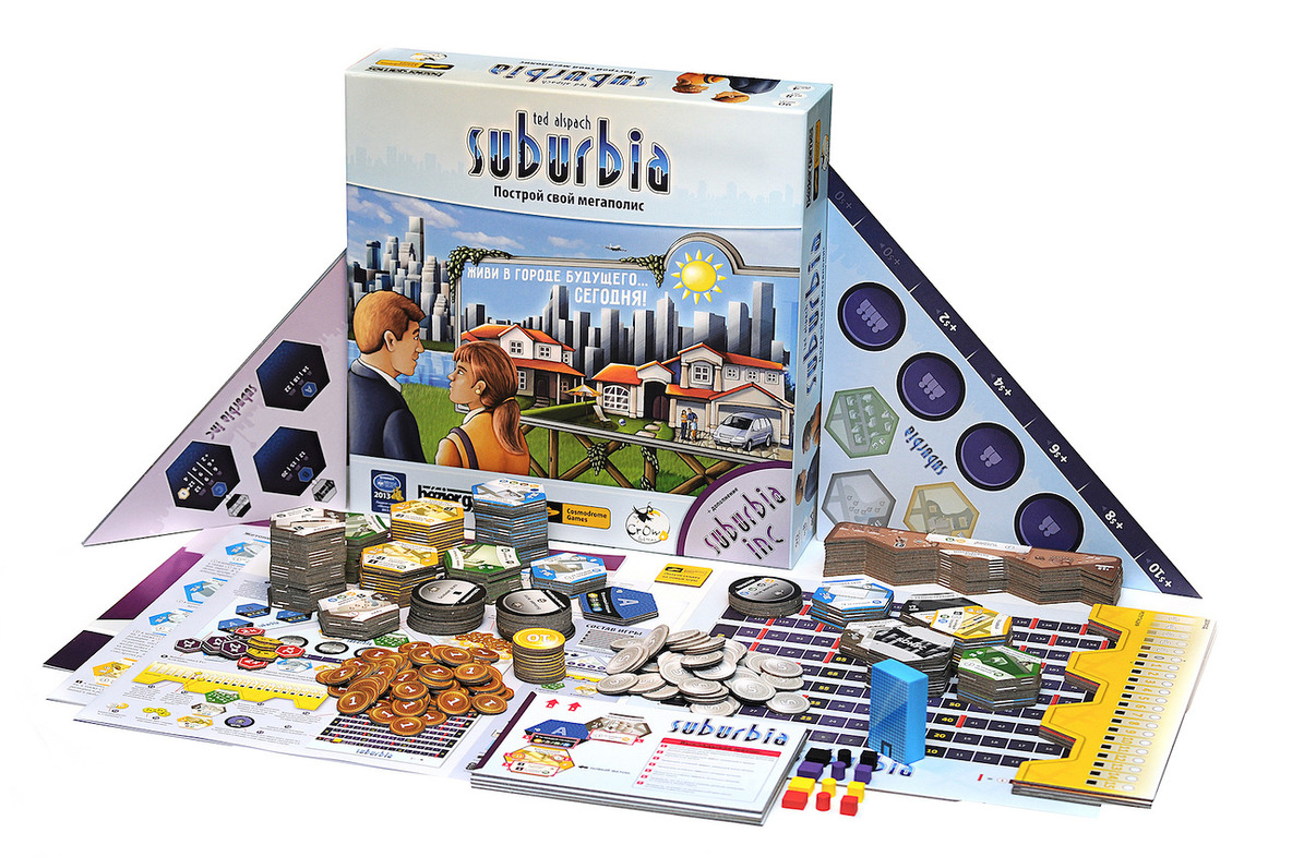 Suburbia – это увлекательная экономическая игра, целью которой является создание крупного густонаселенного мегаполиса. Вся стройка осуществляется с помощью специальных жетонов, которые выступают в качестве зданий, районов, жилых домов, населения, денег. Вся механика игры основана на них, что делает игру простой и интересной. Также в игре есть несколько игровых полей, на которых участники разворачивают свою строку.