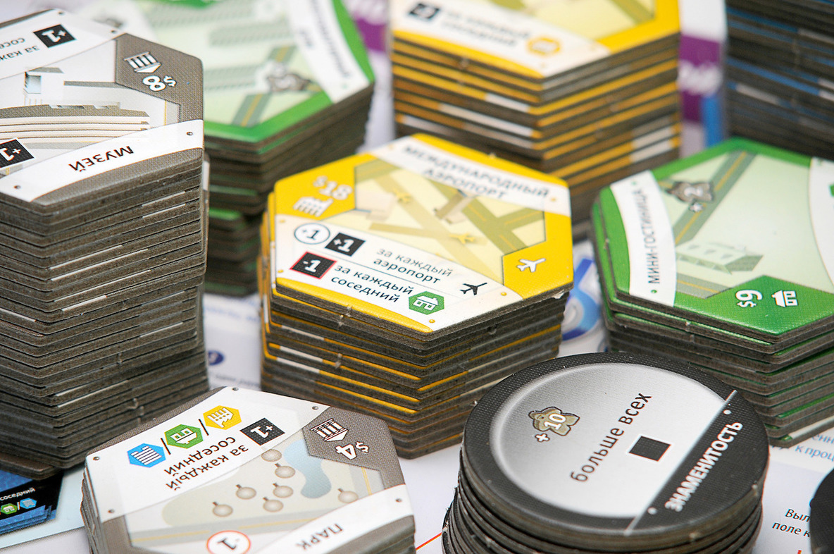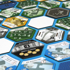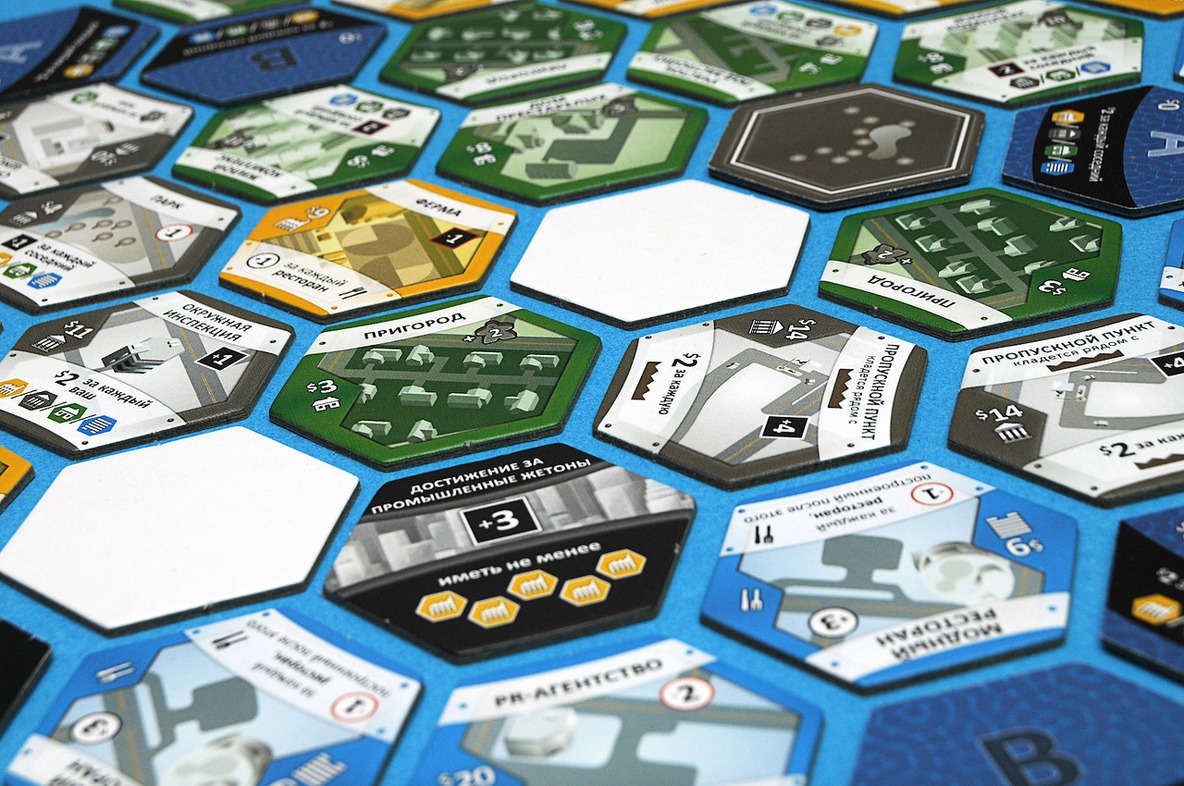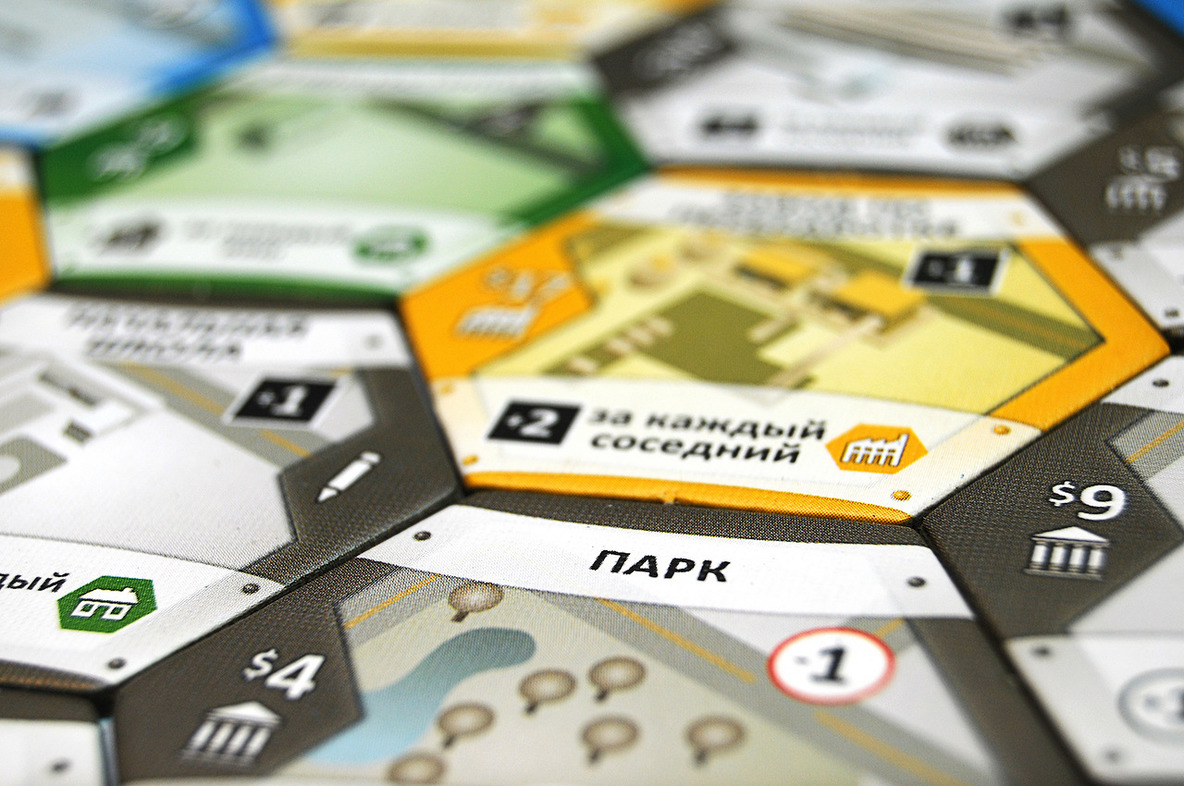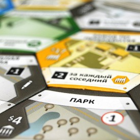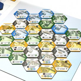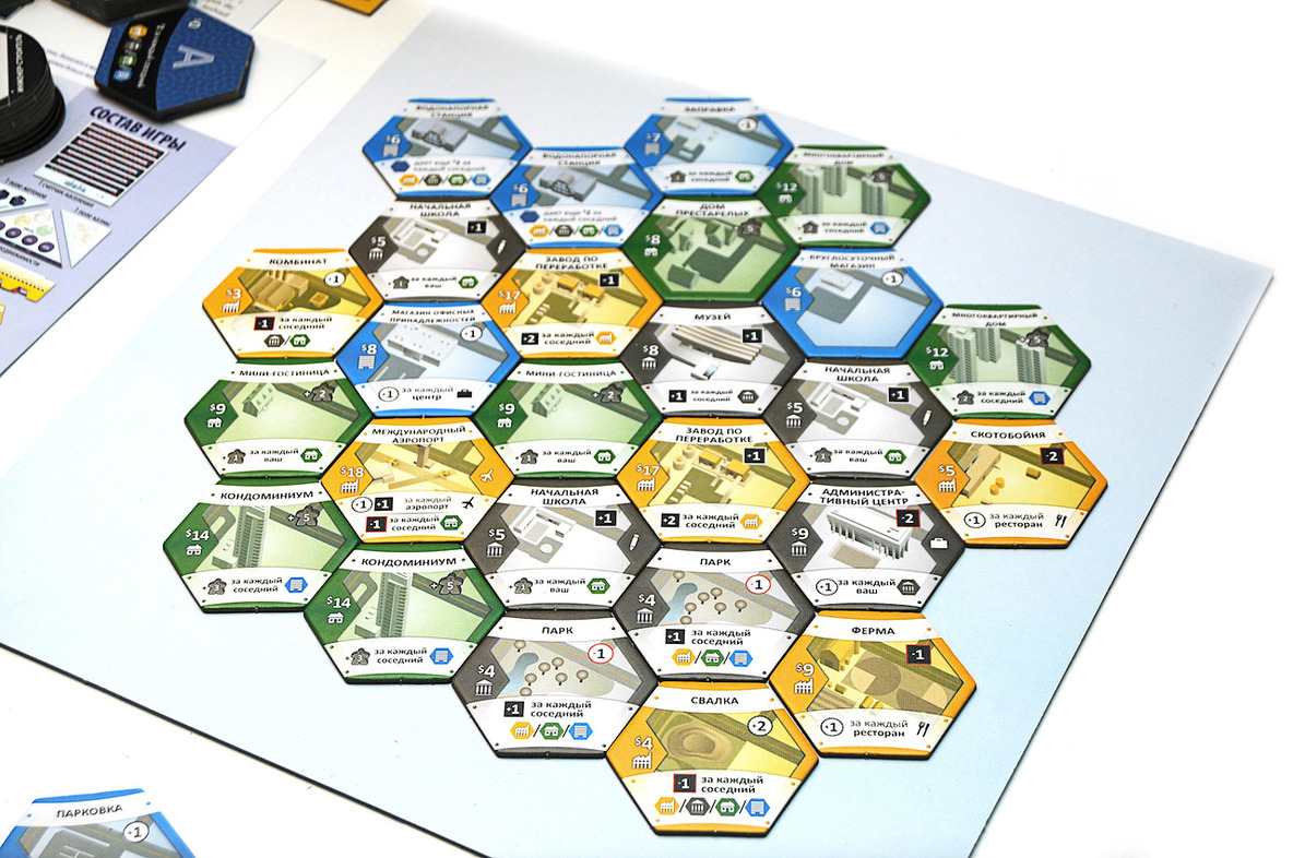 Каждый игрок начинает свой путь градостроителя с трех одинаковых шестигранных жетонов, к которым потом добавляются такие же жетоны. Внешне ваш «город» будет напоминать соты в улье. Игровые жетоны, кроме того, что выдаются за какие-то постройки, могут также оказывать влияние на соседние жетоны, смотря, конечно, куда вы их пристроите. Например, они могут повышать репутацию или увеличивать доход соседнему зданию или, наоборот, оказывать негативное влияние. Тут то как раз и нужно включать свою экономическую жилку, строить стратегию, вырабатывать тактику.