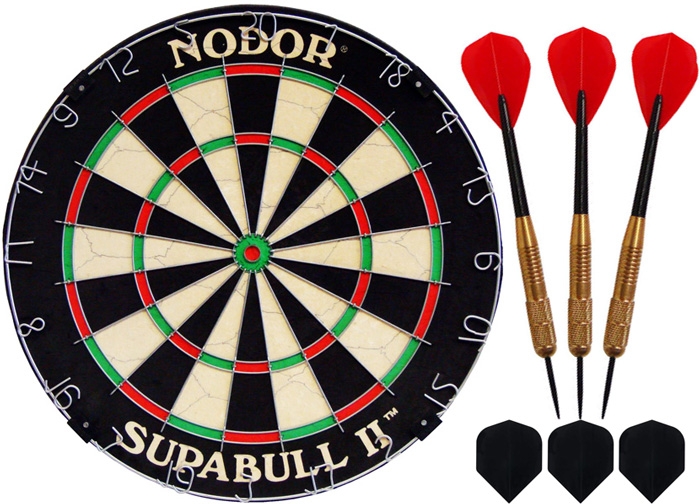 В комплект входит, естественно, – мишень Nodor SupaBull 2, материалом изготовления которой является сизаль, которая значительно лучше и долговечнее, нежели банальный прессованный картон. Дротиков здесь 6 штук модели Nodor NR-4000, с отличными полетными характеристиками. Дополнительно вы получаете комплект оперений, который позволит быстро произвести замену в случае поломки. Для новичков имеется специальная книга, где содержатся правила игры.