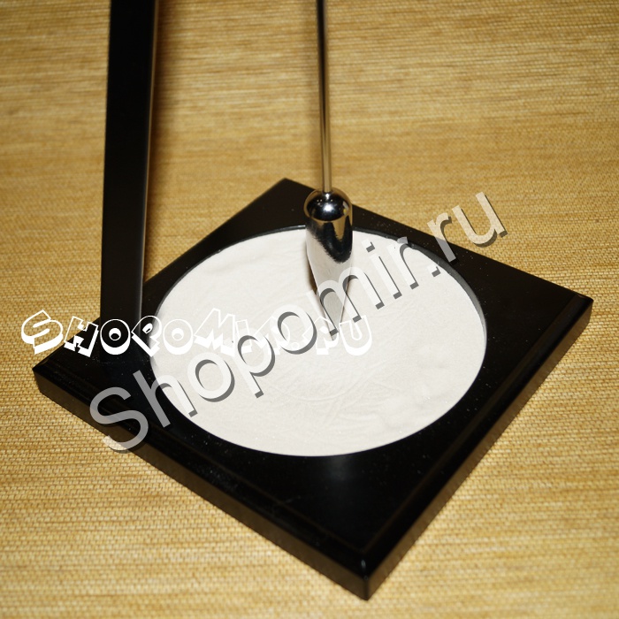 Все его составные части выполнены из дерева, а чаша, вырезанная в основании, наполнена мельчайшим речным песком. Сам металлический маятник подвешен на тонкой стальной трубочке и своим острым носиком едва касается песчаной поверхности. Стоит немного толкнуть его и, мерно раскачиваясь из стороны в сторону, он будет выводить на песочке самые причудливые рисунки.