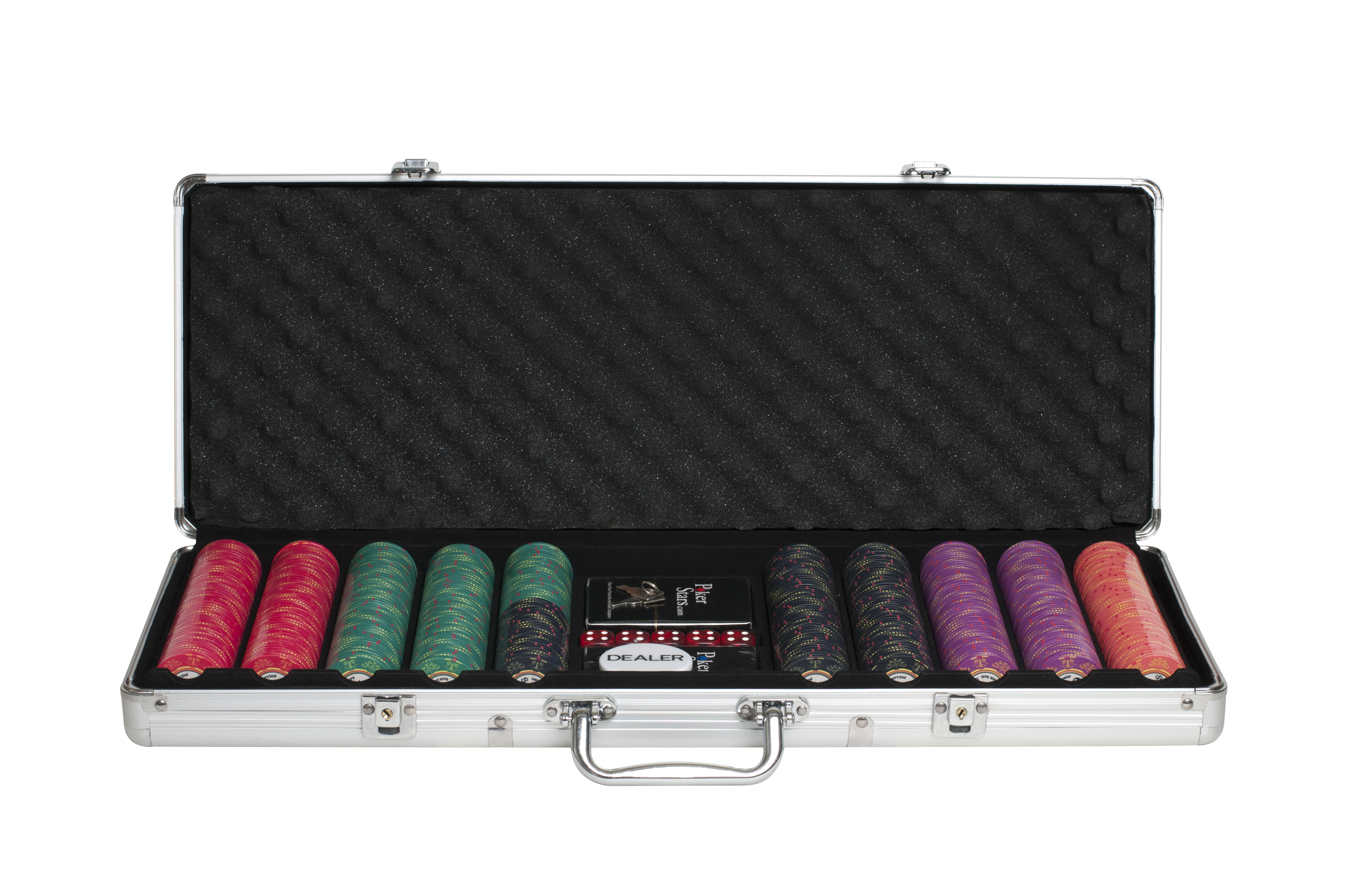 Этот превосходный набор для покера на 500 фишек включает в себя все главные атрибуты игры: фишки с номиналами, имеющие оригинальный фирменный дизайн, 2 колоды карт из 100% пластика, а также игральные кости, фишку дилера и удобный кейс, закрывающийся на ключ. Такой покерный набор, без сомнения, оценит каждый любитель этой популярной азартной игры!
