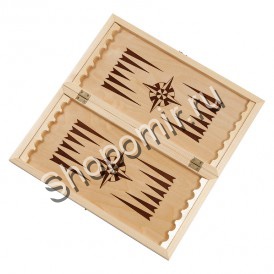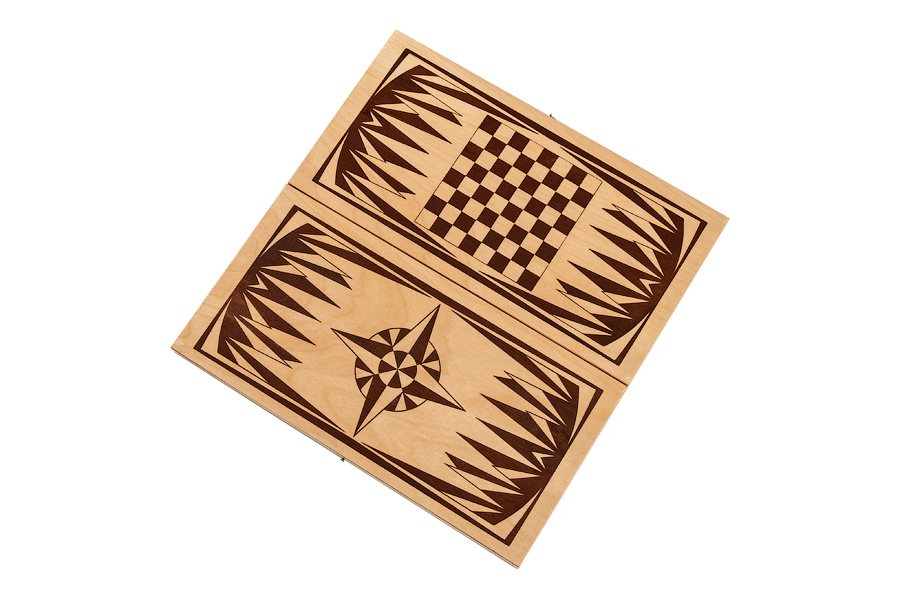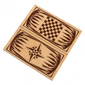 Представленные нарды украшены с внутренней стороны простым и незамысловатым рисунком – роза ветров. В этом можно увидеть некий скрытый смысл, ведь небольшой размер доски предполагает - что она может стать отличным спутником во время путешествия. В качестве материала изготовления, как доски, так и фишек, использовано настоящее дерево, благодаря чему срок службы практически ничем не ограничен.