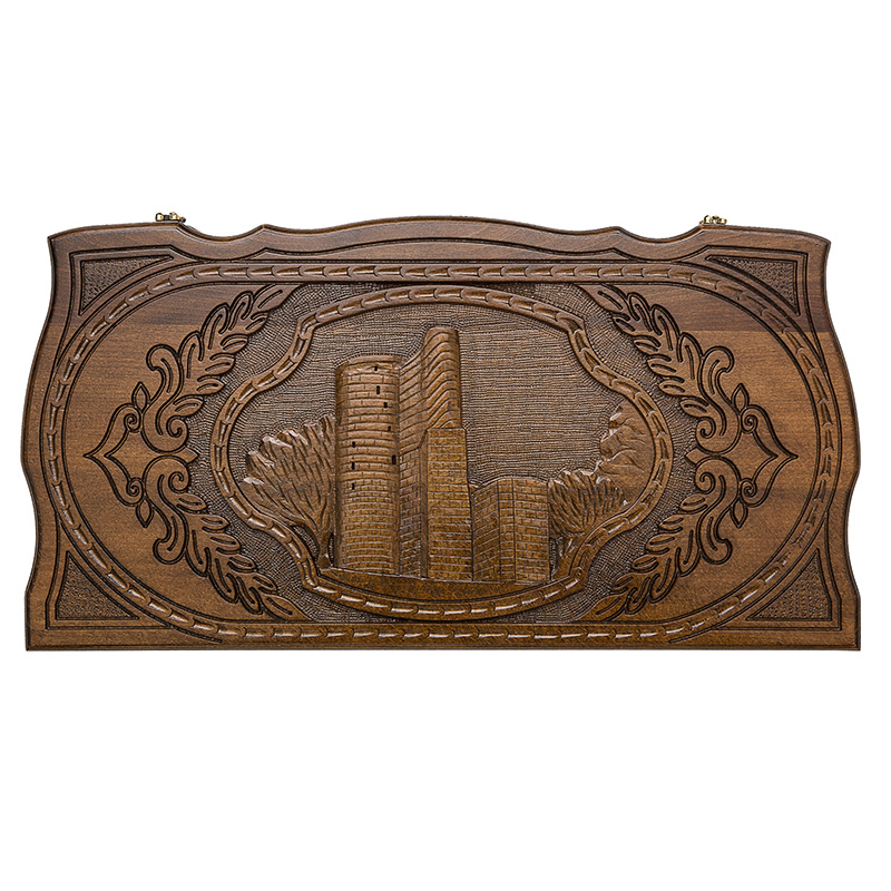 Легкость в работе с орешиной позволяет придать доске нестандартную форму, с привлекательными вырезами, округлостями и узорами. Центральная часть лицевой поверхности украшена изображением сооружения Девичья башня, окруженного ветвями с листьями. Перевернув доску, перед вами предстает поле для игры в шашки, для которого подходят фишки, имеющиеся в комплекте. На резных петлях нанесен радиальный узор, а в середине имеется эмблема производителя. Крючки также сделаны в необычной красивой форме.
