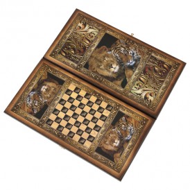 Нарды “Сирия Львы” средние напоминают нам об исторической родине нард - Индии. Центральный рисунок доски изображает льва и тигра. Эти животные имеют особое значение в индийской культуре: лев - символ отваги и мудрости; образ тигра, священного животного, обозначает живость ума и выносливость. Рисунок обрамлён золотистым узором, который завершает композицию.