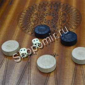 Складная доска нард с ручкой изготовлена из дерева, снаружи отделка тисненой кожей темно-коричневого цвета - имитацией кожи питона, Поле доски украшено по центру восточным выжженным рисунком. Фишки резные.