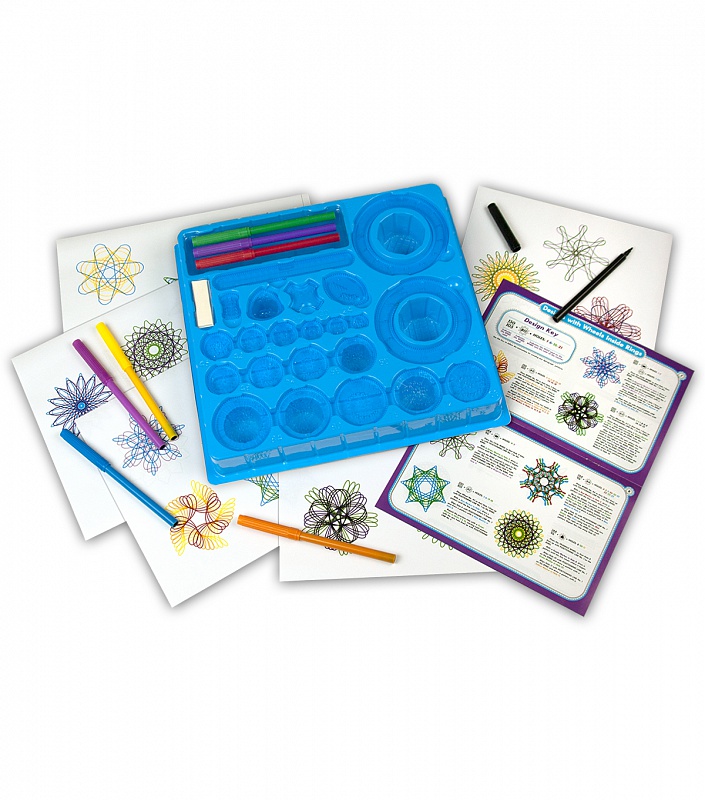 Перед вами – именно тот классический спирограф, который был разработан в середине 60-х годов прошлого века. При помощи всего лишь нескольких приспособлений, спроектированных с математической точностью, вы сможете легко и весело научиться создавать сложнейшие рисунки с переплетением витиеватых спиральных узоров внутри.