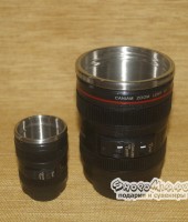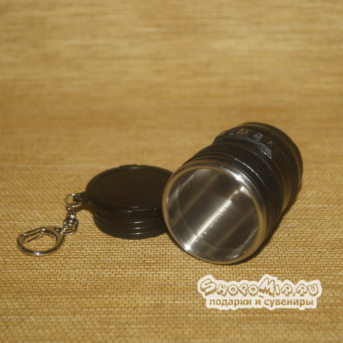 Ведь чудное изделие представляет собой самый настоящий объектив фотоаппарата с завинчивающейся крышкой. Небольшая цепочка и крепкий карабин позволяет использовать миниатюрную стопочку в качестве прикольного брелока для ключей.